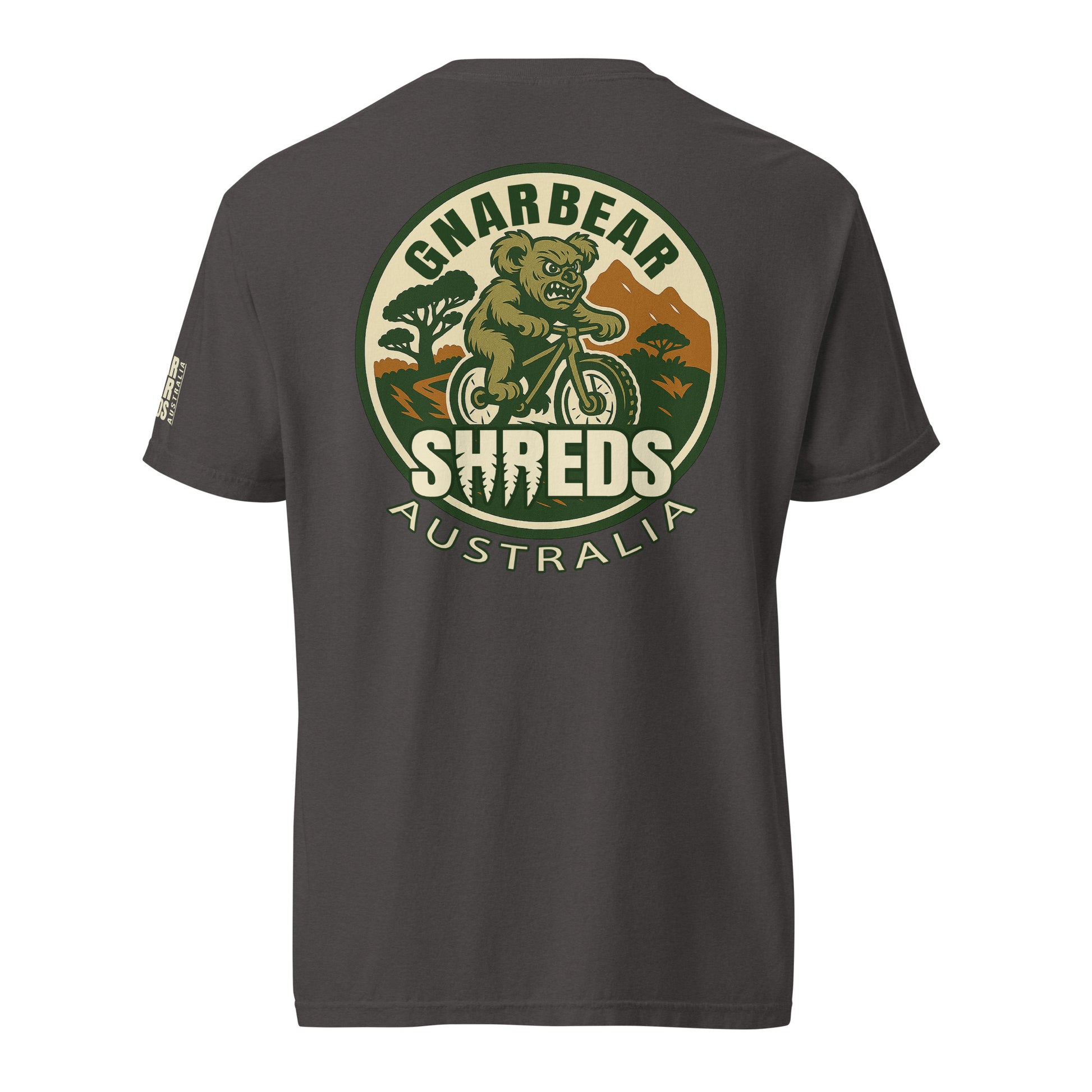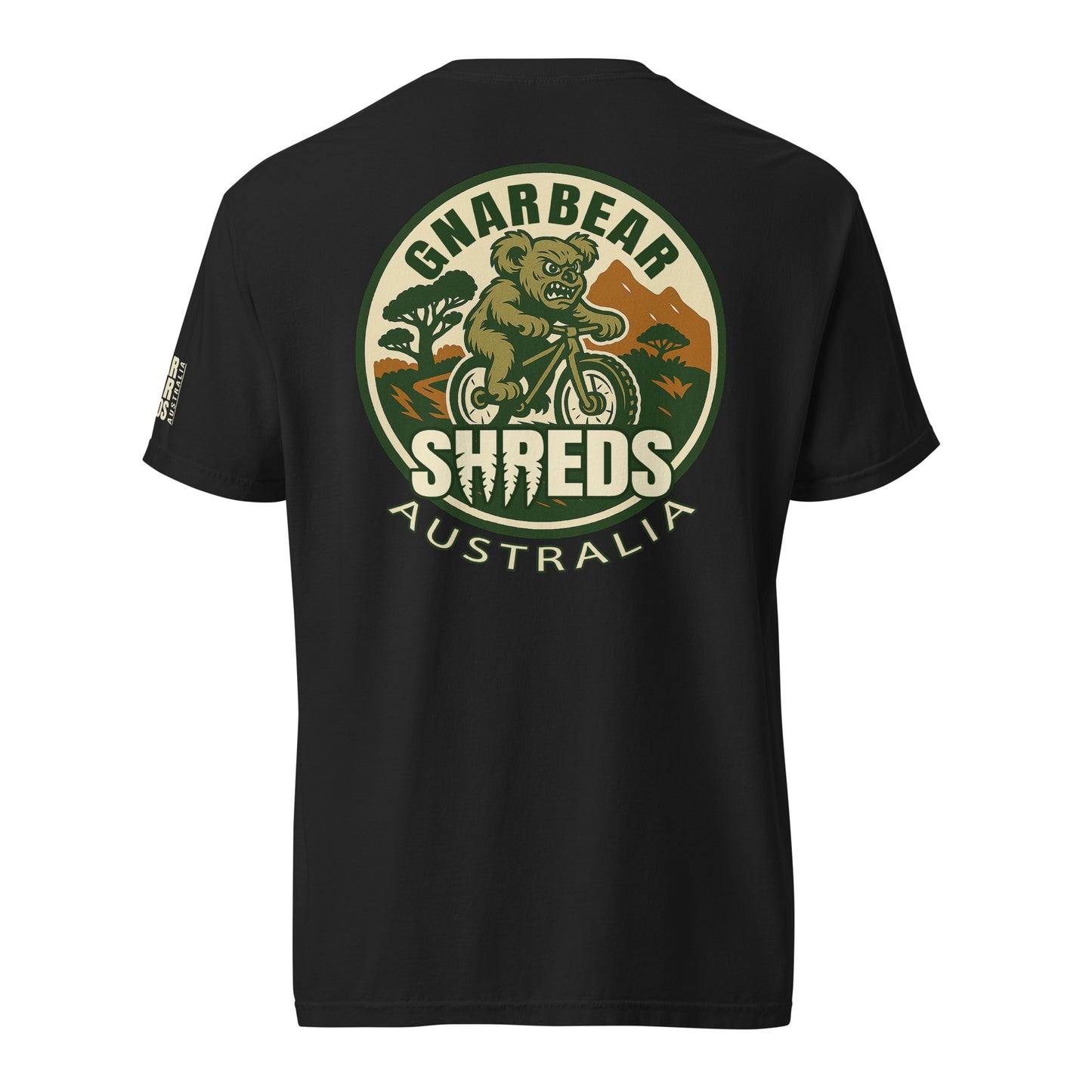 DESIGN EPIPHANY: A fierce symbol born from the legend of Gnarly, the drop bear who could never catch a mountain biker. Instead, he became one, ripping through trails with claws out and fury in his eyes. Worn by those who live to shred, this design blends myth, grit, humour and the untamed energy of the Aussie outback. With hand-detailed typography and claw-marked “SHREDS,” it’s not just a graphic - it’s a badge of fearless riding.