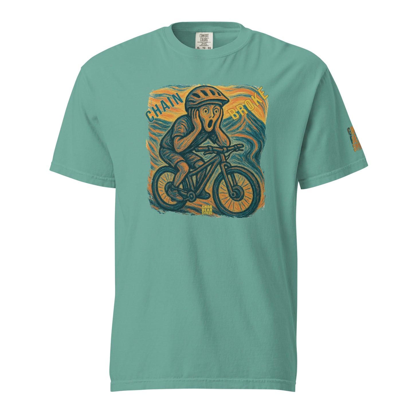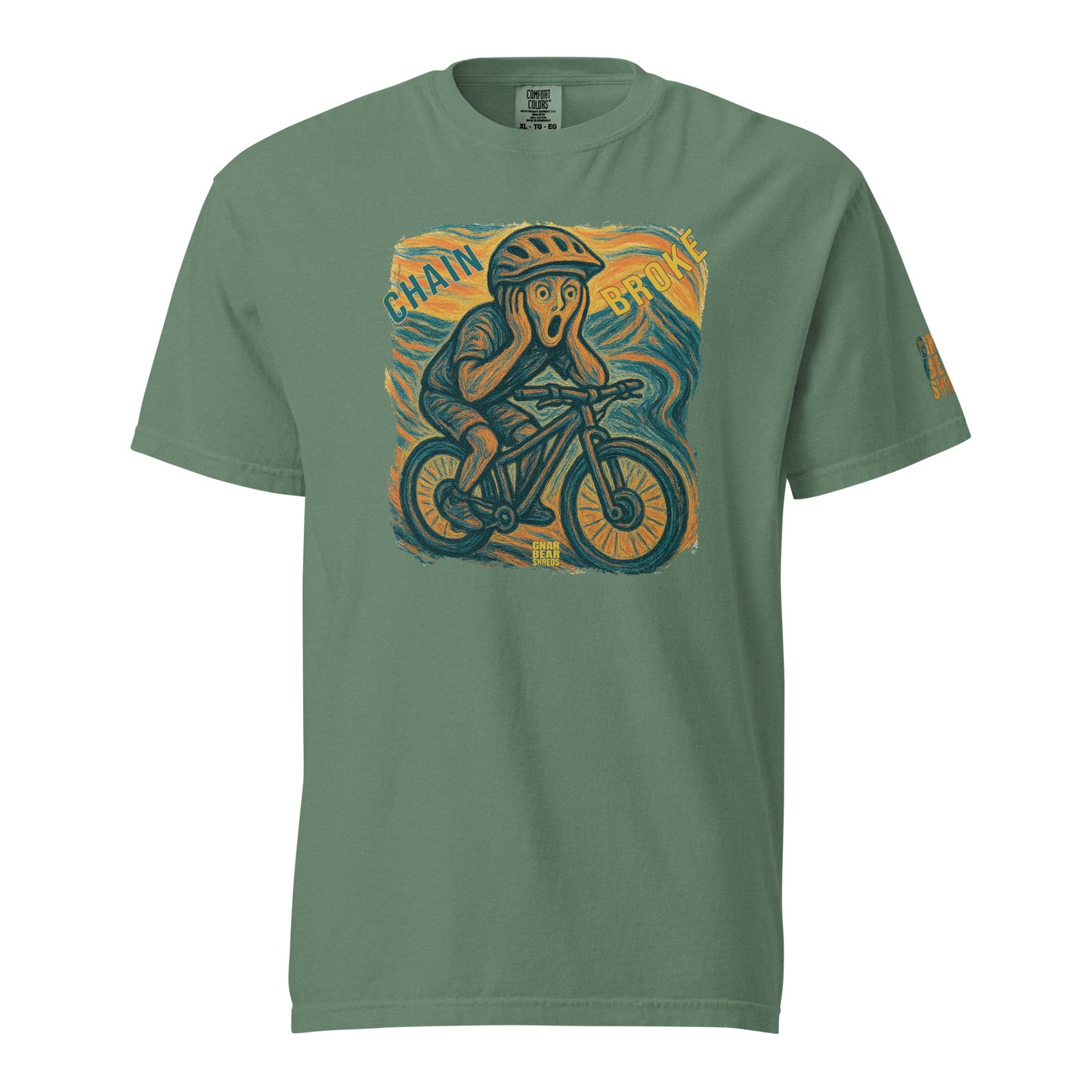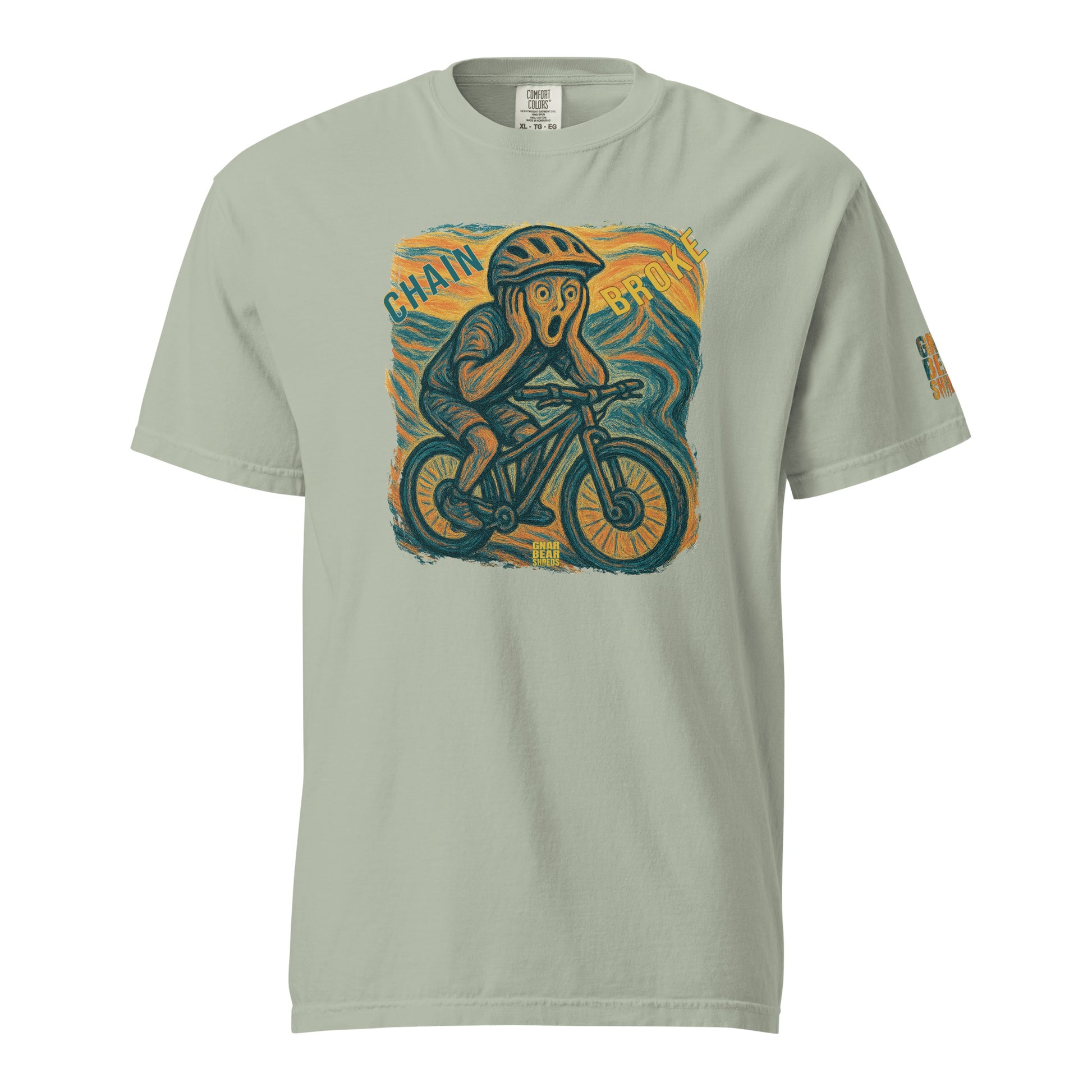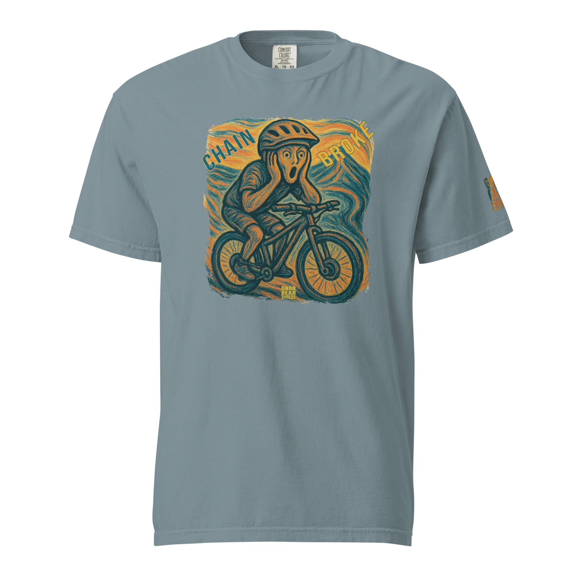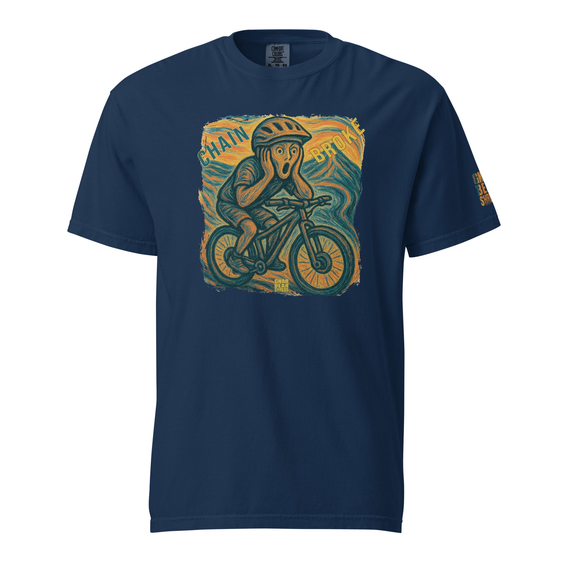 DESIGN EPIPHANY: A chaotic homage to Edvard Munch’s The Scream, is the universal horror of a mountain biker’s worst mechanical nightmare immortalized in vibrant, swirling strokes. Here, the iconic figure is reimagined mid-ride, clutching their head in a moment of pure dread - not from existential angst, but from the unmistakable metallic PING that signals a broken chain.