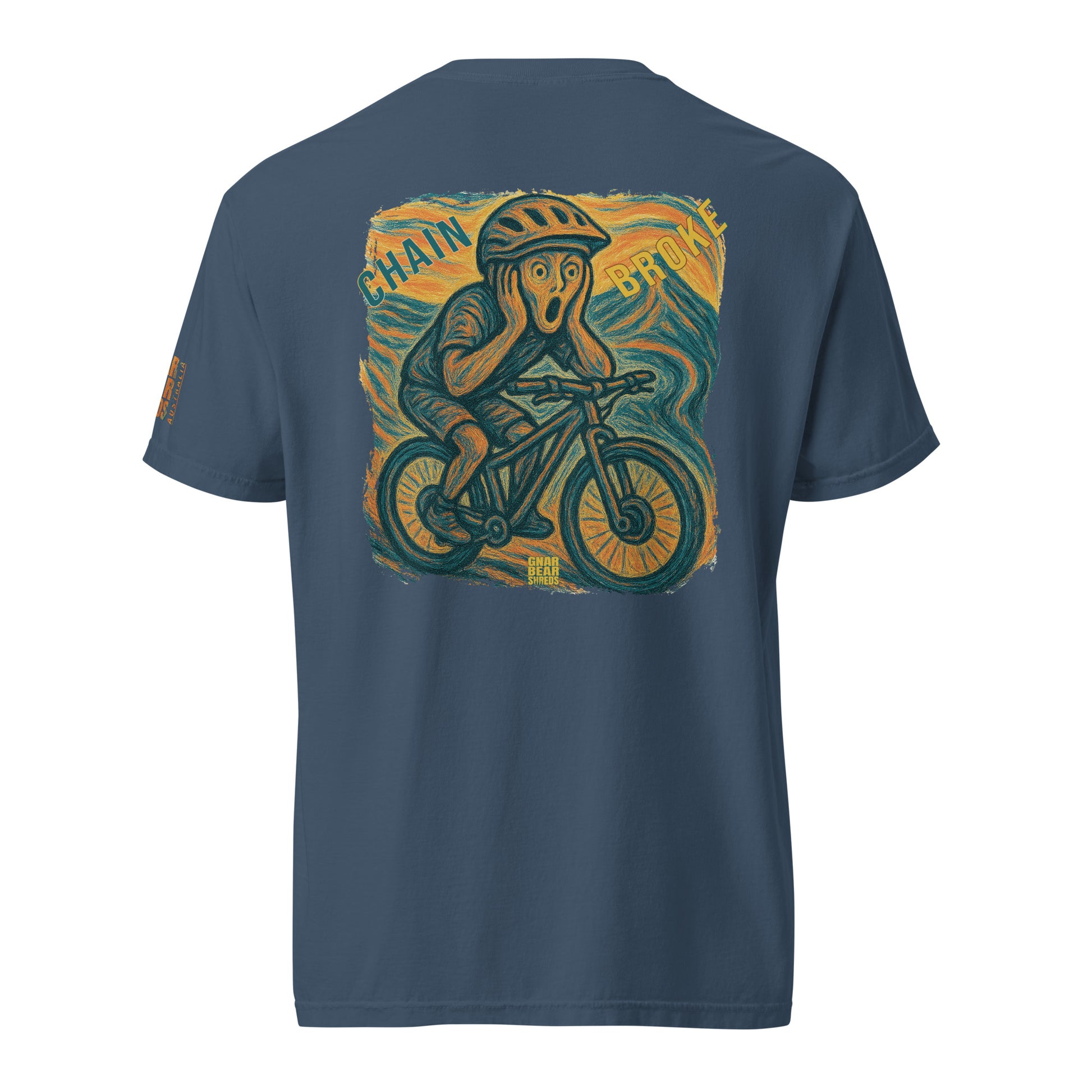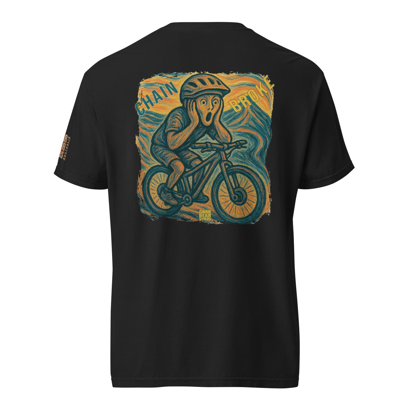 DESIGN EPIPHANY: A chaotic homage to Edvard Munch’s The Scream, is the universal horror of a mountain biker’s worst mechanical nightmare immortalized in vibrant, swirling strokes. Here, the iconic figure is reimagined mid-ride, clutching their head in a moment of pure dread - not from existential angst, but from the unmistakable metallic PING that signals a broken chain.