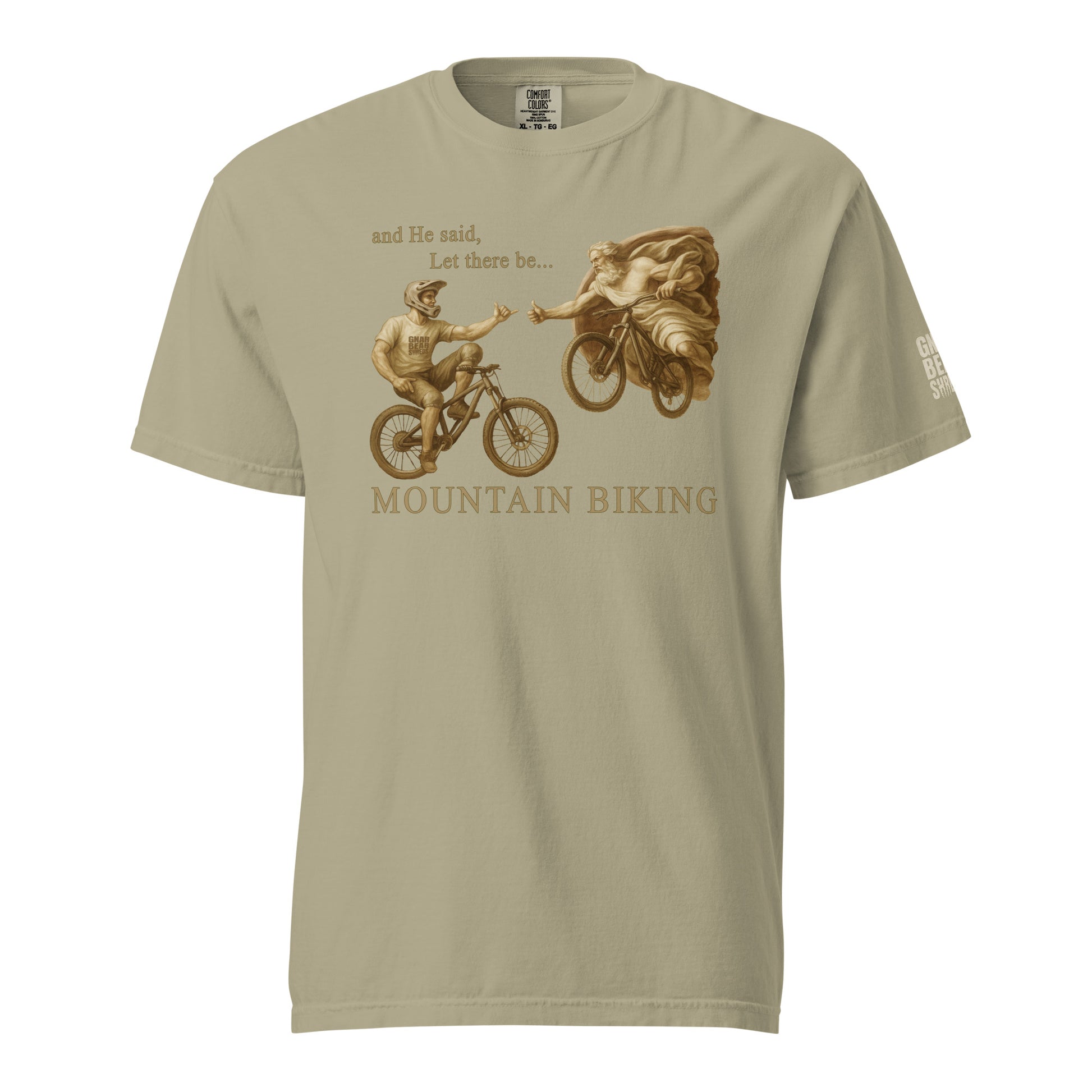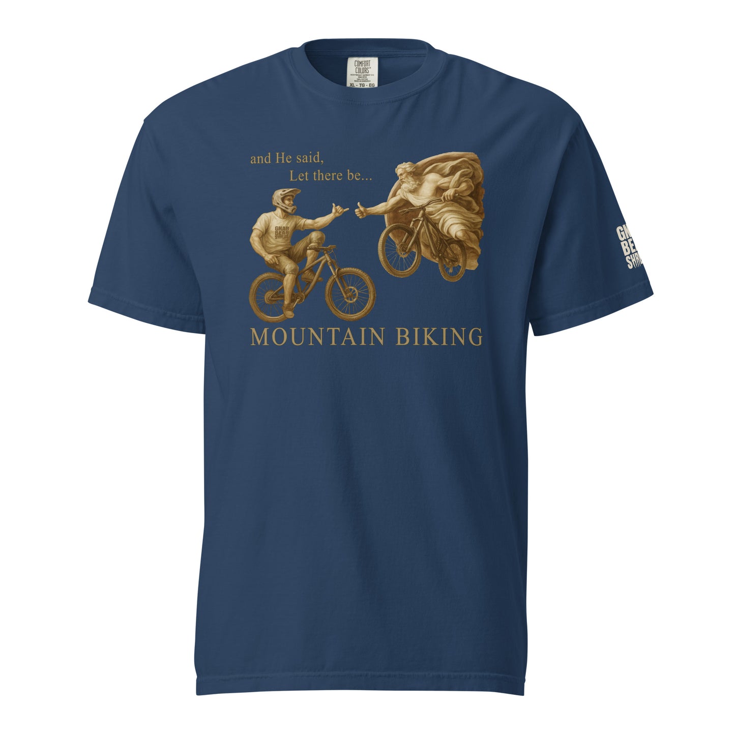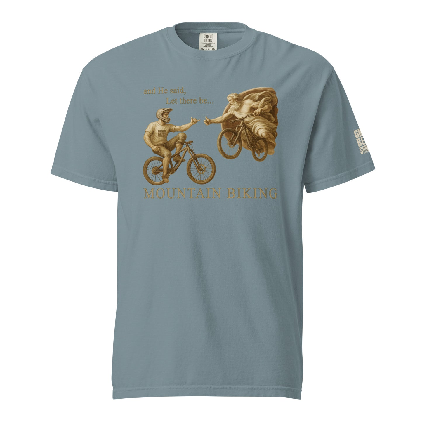 Design Epiphany: A divine spark. A dirt-stained imagining. This surreal take on Michelangelo’s masterpiece, etched into marble, re-imagines the moment mountain biking was willed into existence. One hand reaches out from the heavens, the other throws a shaka from the saddle – a silent agreement that the mountains were meant to be ridden. This design speaks to riders who believe the trail is more than dirt – it’s a destiny.